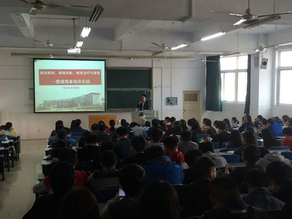 朱国苗博士首先回忆了其本科阶段在母校安徽中医药大学的学习经历,介绍了毕业后的硕博阶段的学习以及后来自主创业的体会。在题为“精细解剖、精确诊断、精准治疗与康复――腰痛推拿临床实践”的报告中,朱国苗结合自己在临床中的实践经历讲述了熟知精细解剖知识对于针灸推拿临床的重要性,勉励在场的本科生和研究生在学校学习阶段要将解剖学习好,将解剖学课程学习与临床实践相结合,将中国传统的推拿技术与现代精细解剖相结合。谈及辞职创建康复中心,认为可以将临床医疗和康复治疗结合,更有效地发挥作用,避免偏重于治疗而忽视康复的缺憾。会上朱国苗与师生交流互动,就同学们提出的问题做出解答,并现场示范教学,探讨如何改进传统的诊断治疗方式,从而使推拿和康复治疗发挥更大的作用;鼓励同学们在学校阶段一定要打下扎实的基础,为以后的进一步学习和工作提供充足的知识储备,做一名优秀的临床医务工作者。